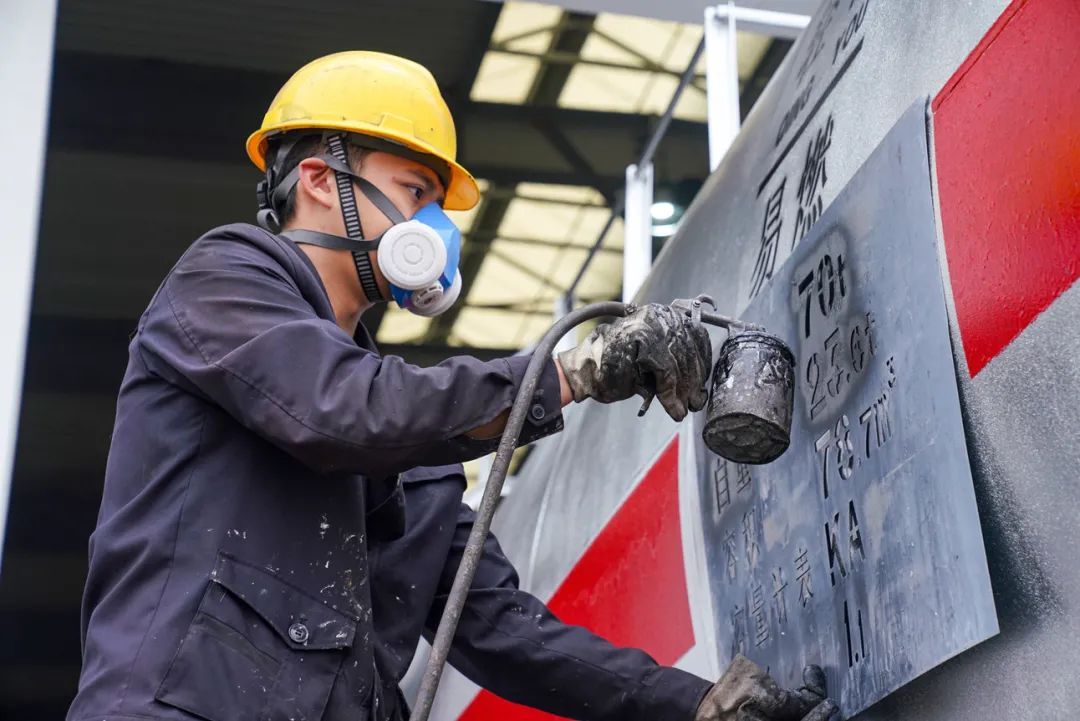 “叮当叮当……”标签牌相互碰撞,发出清脆的声音,像是在吹响“战斗”冲锋号。“滋滋滋……”黄桦军的左手在车体上固定住标签板,右手按下喷枪,白色的油漆呈伞状喷出,瞬间一股油漆味向周围发散,白油漆也星星似地点缀在他的衣服上。