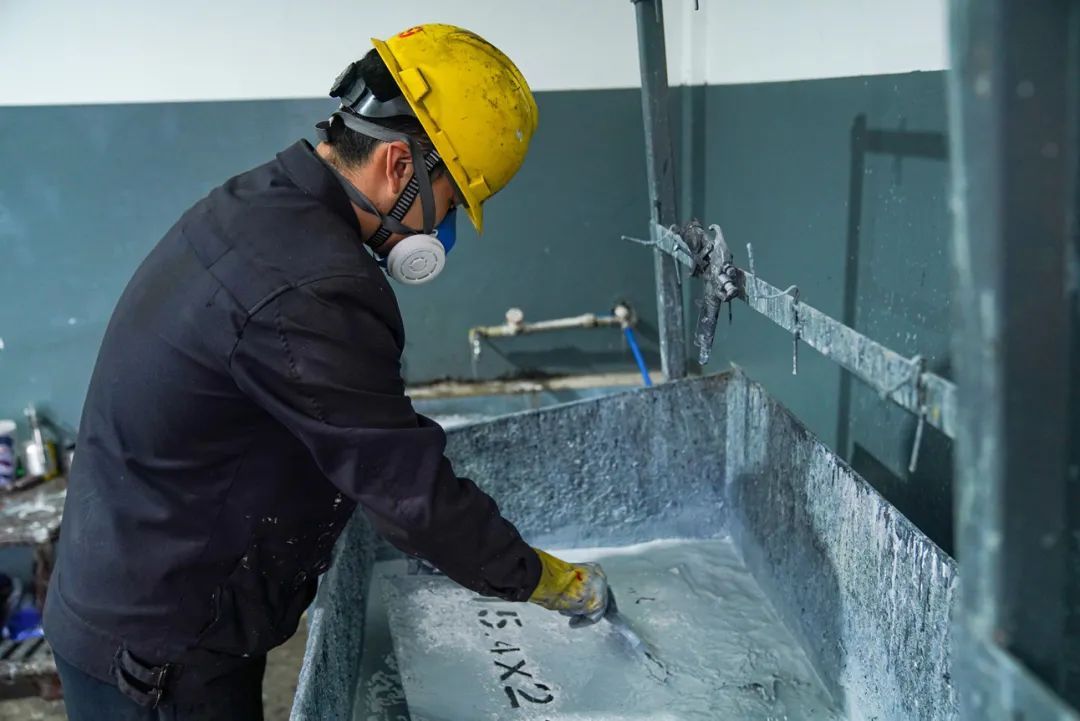 历经两个小时的奋战,黄桦军和组员终于完成了最后一条色带的涂刷。他脱下防毒面具,捧起水壶就是一顿痛饮。此时他的黑色工作服也显得格外“出彩”:白色、红色、黄色、银色……俨然一套亮丽的“迷彩服”。